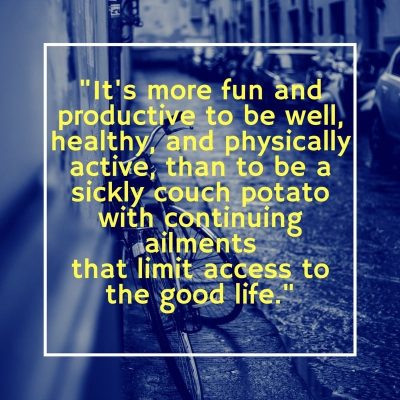 Once arriving to a relatively healthy state (a relative condition) it becomes obvious that it’s more fun and productive to be well, healthy and physically active, than to be a sickly couch potato with continuing ailments that limit access to the good life. There are so many healthful avenues in America — food, exercise, physical/mental stimulation, compared to other countries in which I’ve lived — that it’s easy to pursue such desirable outcomes once they are understood.