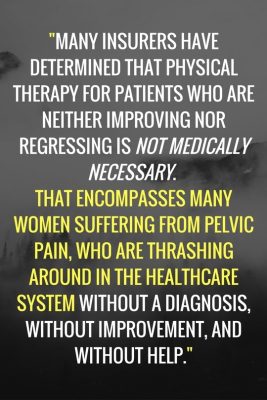 These provisions aren’t uncommon, but they’re devastatingly harmful to women in pain. For example, Aetna’s website provides that “physical therapy in persons whose condition is neither regressing nor improving is considered not medically necessary.” That encompasses many women suffering from pelvic pain, who are thrashing around in the healthcare system without a diagnosis, without improvement, and without help.
