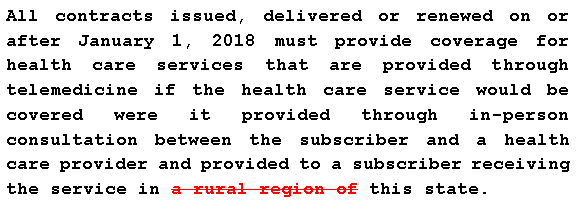 The new law removed the red-lined phrase, requiring coverage for telehealth services regardless of the patient’s locale.